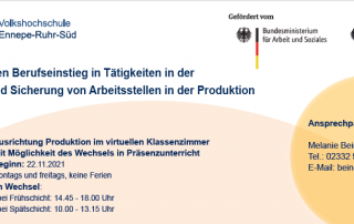 Pilotprojekt in Zusammenarbeit mit dem Bundesamt für Migration und Flüchtlinge (BAMF) und der VHS Ennepe-Ruhr-Süd „Deutschkurse für den Berufseinstieg in Tätigkeiten in der Produktion und Sicherung von Arbeitsstellen in der Produktion“ Ein neues Unterrichtszeit-Modell, das sicher Schule machen wird: Wöchentliche alternierende Unterrichtszeiten zur perfekten Integration in den Wechselschicht-Betrieb. Diese Idee ist aus unseren betrieblichen Notwendigkeiten [...]